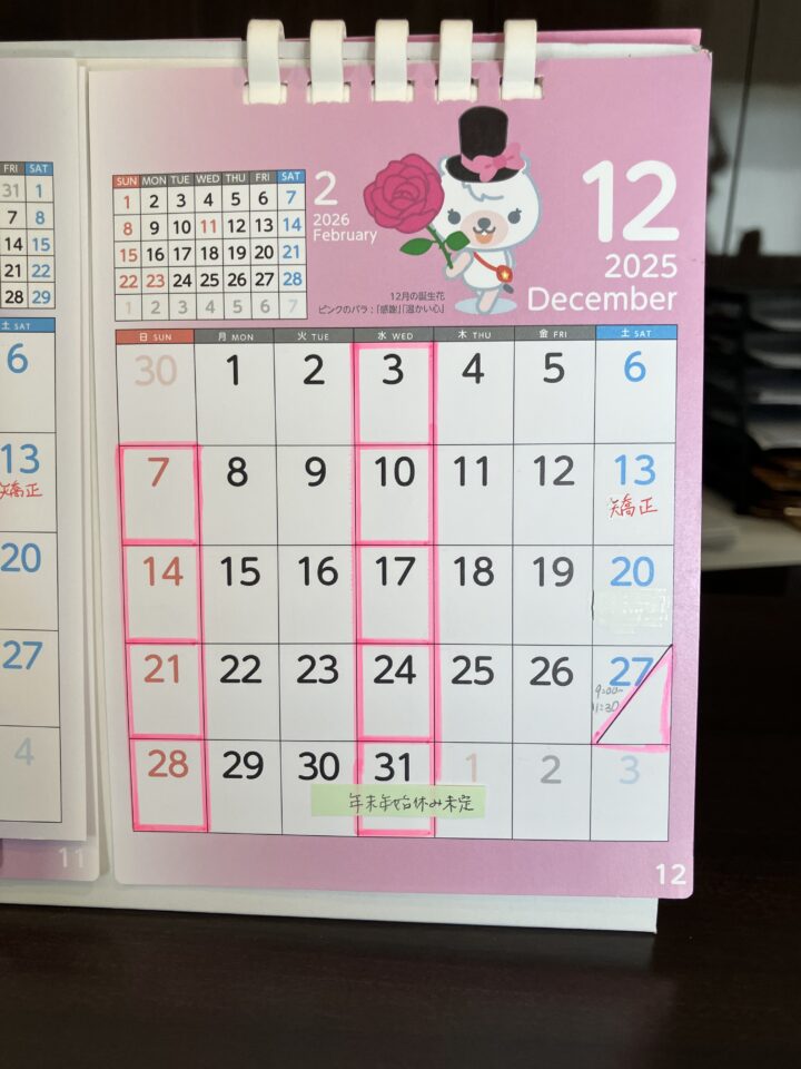 12月休診のお知らせ 2025.12.01 お知らせ よこやま歯科12月の休診になります。 12月3日・7日・10日・14日・17日・21日・24日・27日( 午後)・24日・28日~(年末の診療変更になることがあります)